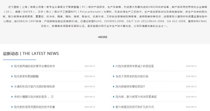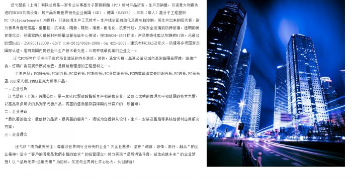 迂弋塑膠(上海)有限公司是一家專業(yè)從事高分子聚碳酸酯(PC)板材產(chǎn)品研發(fā)、生產(chǎn)及銷售,引進意大利最先進的UNION共擠設(shè)備,其產(chǎn)品采用世界領(lǐng)先企業(yè)美國(GE)、德國(BAYER)、日本(帝人)高分子工程塑料PC(Polycarbonate)為原料,引進臺灣生產(chǎn)工藝技術(shù)。生產(chǎn)線全部自動化及微電腦控制,所生產(chǎn)出來的陽光板、耐力板具有透明度高、重量輕、抗沖擊、隔音、隔熱、難燃、耐老化、抗紫外線,又稱安全玻璃或防彈玻璃,透明鋼美稱等優(yōu)點,經(jīng)國家防火建筑材料質(zhì)量監(jiān)督檢驗中心測試,按GB8624-1997標準,產(chǎn)品燃燒性能達到難燃B1級。已通過歐盟RoHS、ISO9001:2008、GB/T 116-2012/8624-2006、GA 422-2008、建筑材料CNAS及防火、防爆等多項國家及國際認證。是目前國內(nèi)同行業(yè)中生產(chǎn)技術(shù)最先進、公司環(huán)境最優(yōu)美的企業(yè)之一。