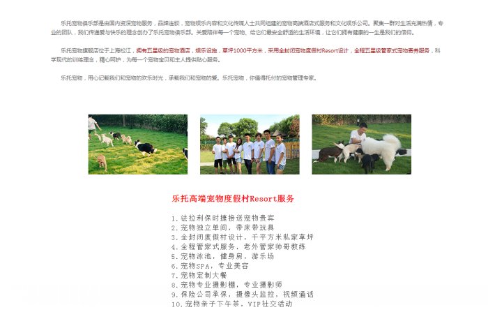 樂托寵物俱樂部是由國內資深寵物服務,品牌連鎖,寵物娛樂內容和文化傳媒人士共同組建的寵物高端酒店式服務和文化娛樂公司。聚集一群對生活充滿熱情,專業的團隊,我們傳遞愛與快樂的理念創辦了樂托寵物俱樂部。關愛陪伴每一個寵物、給它們最安全舒適的生活環境,讓它們擁有健康的一生是我們的信仰。