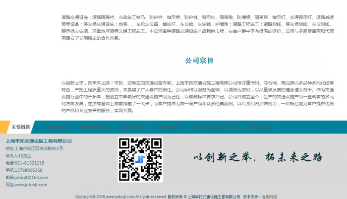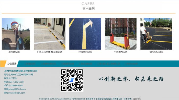 上海舉拓交通設施工程有限公司是一家集交通設施產品銷售、研發、設計以及道路、停車場工程、施工、維護、為一體綜合性上海交通設施工程有限公司,我們擁有優秀的團隊,最具創新的意識,先進的設備以及最完善的服務,確保產品以及工程質量,嚴格依據ISO9001、ISO2000質量管理體系來執行。