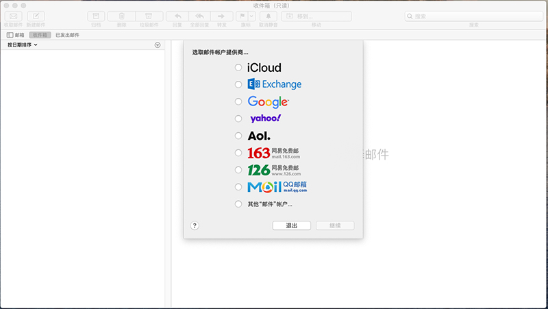 上圖中勾選最后一個‘其他郵件帳戶’選項,點擊“繼續”按鈕。