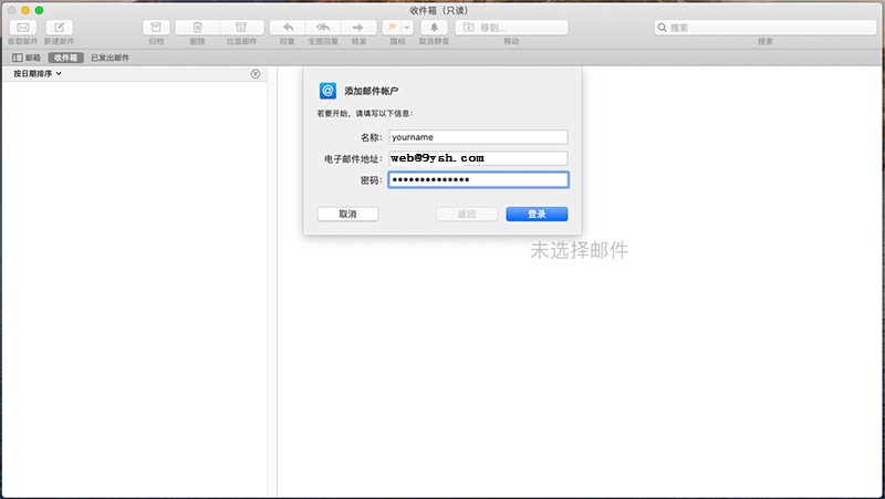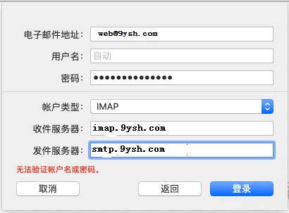 在上圖彈出框中,填寫您的名稱(沒有特殊限制,您可以隨意填寫),電子郵件地址和對應的密碼。上圖以web@9ysh.com為例,您應該填寫您自己的郵件地址。完成后點擊“登錄”按鈕。