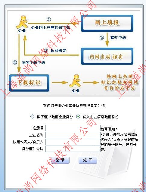 點(diǎn)擊“企業(yè)網(wǎng)上亮照標(biāo)識(shí)下載”模塊,輸入“用戶名”和“密碼”進(jìn)行登錄(首次登錄的用戶須先進(jìn)行注冊(cè)),進(jìn)入“企業(yè)營(yíng)業(yè)執(zhí)照亮照備案系統(tǒng)”頁(yè)面,輸入企業(yè)信息(企業(yè)標(biāo)識(shí)、注冊(cè)號(hào)、企業(yè)名稱、法定代表人/負(fù)責(zé)人、證件號(hào))驗(yàn)證身份。已經(jīng)領(lǐng)取數(shù)字證書(營(yíng)業(yè)執(zhí)照電子副本)的企業(yè),可直接用數(shù)字證書驗(yàn)證企業(yè)身份。