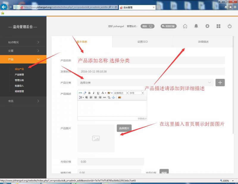 6. 添加產(chǎn)品:點(diǎn)擊添加產(chǎn)品,輸入產(chǎn)品名稱(chēng),選擇產(chǎn)品分類(lèi),點(diǎn)擊產(chǎn)品圖片,插入首頁(yè)展示封面圖片,最后輸入產(chǎn)品內(nèi)容即可。