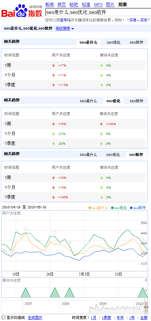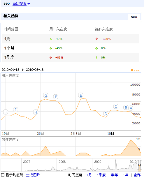 3、通過百度指數(shù),你會發(fā)現(xiàn),SEO的指數(shù)顯示它的日IP搜索量達(dá)到了4000左右,甚至高的時(shí)候,可以達(dá)到7000以上,那么我們又可以通過這個(gè) 來斷定這個(gè)關(guān)鍵詞的競爭性也很強(qiáng)。一般來說,百度指數(shù)在1000以上的關(guān)鍵詞我們都認(rèn)同為其競爭性較強(qiáng)。所以作為新手新站來說,我們就要盡量去避開這些競 爭性強(qiáng)的熱門關(guān)鍵詞。當(dāng)然,我們并不反對你以這個(gè)關(guān)鍵詞來做為你的目標(biāo)關(guān)鍵詞,如果你有足夠的資源,實(shí)力及時(shí)間去做的話,也是有可能做到你所期望的效果 的。